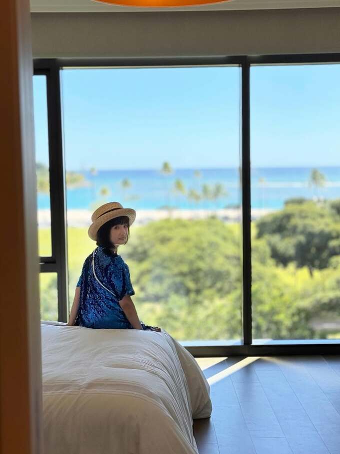 千秋さんは、「なんだこの服」と書き出し、青く輝くスパンコールのワンピースを身にまとい、ストローハットをかぶった姿でハワイ滞在中のオフショットを投稿。