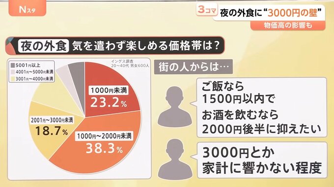 街の人からは「ご飯なら1500円以内で、お酒を飲むなら2000円後半に抑えたい」、「3000円とか家計に響かない程度」という声も聞かれていて、皆さん夜の外食の価格は抑えているという状況です。