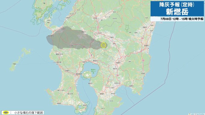 新燃岳は噴火警戒レベル3(入山規制)です。新燃岳で噴火が発生した場合には、8日午前9時から12時までは火口から西方向、8日午後9時から9日午前0時までは火口から西方向に降灰が予想されます。
