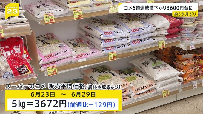 6週連続の値下がりです。農林水産省によりますと、6月23日から29日までに全国のスーパーで販売されたコメ5キロの平均価格は、前の週より129円下がって3672円となりました。6週連続の値下がりで、3600円台になるの…