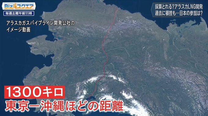 アジアへの輸出には、アラスカ北部から太平洋に面した南部までガスを送るパイプラインを建設する必要があるが、その長さは実に1300km。東京と沖縄本島を結ぶような距離だ。