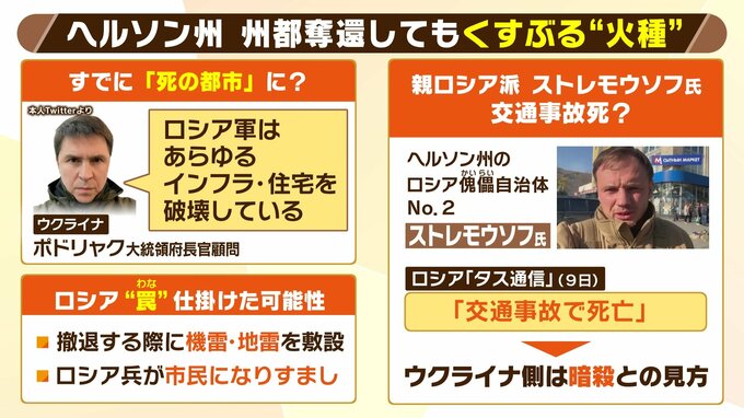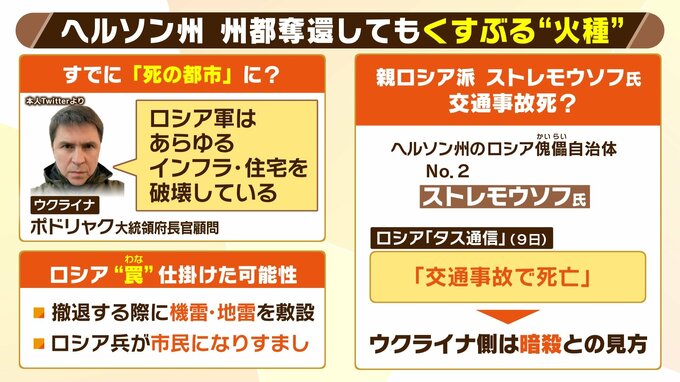 「やはり口封じということだと思います。親ロシア派の幹部でありながら国防省を非常に批判していた人だったんです。西側のメディアは常にこの人の発言をチェックしていました。もし暗殺であれば、今後ヘルソン州の東南側に移ってきたときにストレモウソフ氏の発言が国民を揺さぶる可能性もある。というところで暗殺という見方が出てきてるのかなという感じがいたします」