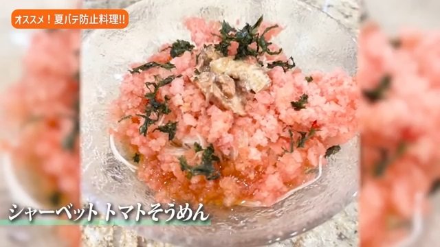 特に工夫が凝らされているのは夏バテ防止の料理です。「すり下ろしトマトそうめん」は家族に大好評だったとか。「前の晩から大きなトマトを買ってきて、ヘタを取って冷凍庫で凍らせ、食べる前に流水で皮を剥いてすり下ろし、トマトのシャーベットを作るんです」と調理法を紹介。茹でたそうめんの上に麺つゆとすり下ろしトマト、さらに缶詰のサバの味噌煮をのせた一品は、見た目にも涼しく塩分も取れる工夫がされています。