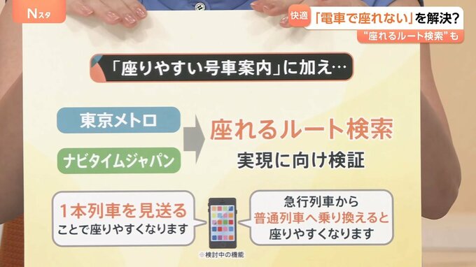 「座りやすい車両」の案内に加えて、「座れるルート検索」も検討しているということです。