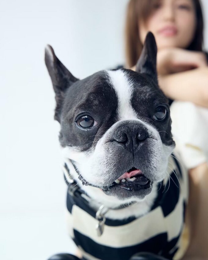 写真では、白黒の短毛種できょろりと大きな目をした「アムちゃん」が、川口さんと握手をしながら見つめ合っています。