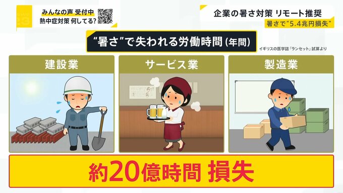それが、イギリスの医学誌「ランセット」による失われた「労働時間」の試算。日本では暑さによる作業効率の低下などにより、建設業やサービス業などの労働時間がおよそ20億時間が失われているといいます。