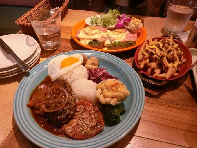 投稿には料理の写真も添えられており、鮮やかなブルーのプレートに盛り付けられたハンバーグロコモコ。別のプレートには、フレンチフライにチリコンカンとチェダーチーズをトッピングしたナチョポテト。