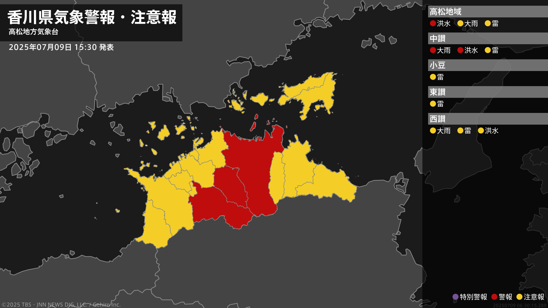 気象台は、午後3時30分に、洪水警報を高松市、綾川町に発表しました。また大雨警報(浸水害)を綾川町に発表しました。