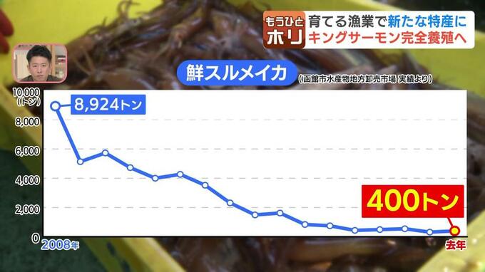 キングサーモンの養殖に乗り出した背景にあるのは、スルメイカの記録的な不漁です。