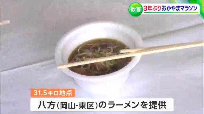 31・5キロ地点では名物となったラーメン給食。岡山市東区の八方によるこの日のための特製ラーメンをランナーがここでは足を止めて味わいます。