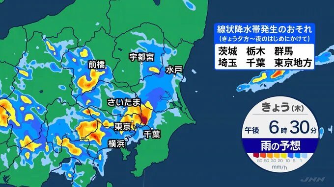 きょう夕方から午後9時ごろにかけて、神奈川県を除く関東地方の1都5県で、「線状降水帯が発生して大雨災害発生の危険度が急激に高まる可能性がある」として、気象庁が線状降水帯の“半日前予測”情報を発表しました。