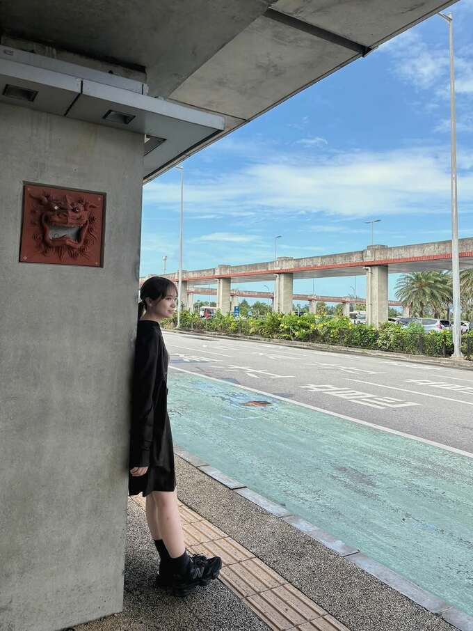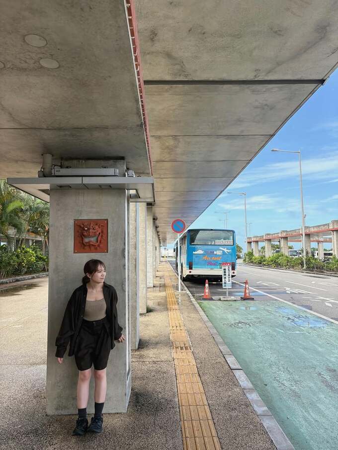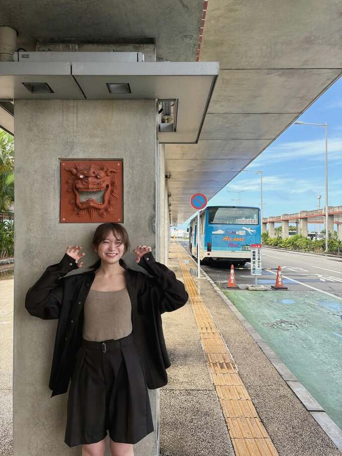 青空が広がる沖縄の地で、秋元さんは黒を基調としたシックなスタイルを選択。黒のジャケットにベージュのインナーを合わせた大人っぽいコーディネートが、南国の明るい風景と対照的な印象を与えています。足元も黒い靴で統一し、都会的な雰囲気を醸し出しています。