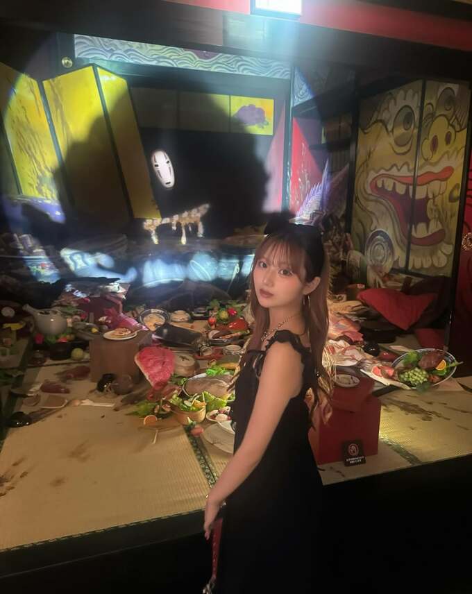 展示では『千と千尋の神隠し』の油屋を思わせる和風の空間も再現されていました。食べ物が散らばった畳の部屋や、壁に描かれた妖怪の絵など、細部まで作り込まれた空間に希空さんは足を踏み入れています。