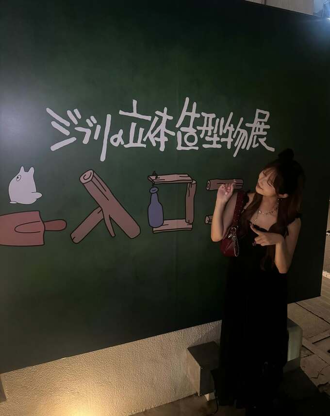 会場内には『となりのトトロ』の一場面を再現した展示も。大きなトトロの人形と緑の苔に囲まれた空間で、希空さんは優しい笑顔を見せています。黒いドレスと緑豊かな展示のコントラストが印象的な一枚となっています。