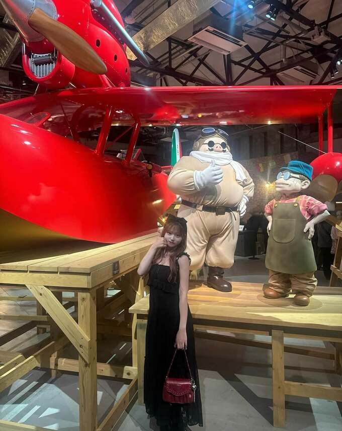 『紅の豚』の世界を再現した展示では、鮮やかな赤色の飛行艇とパイロットの立体造形物の前で希空さんがポーズをとっています。黒いドレス姿と赤い飛行艇のコントラストが目を引く一枚です。