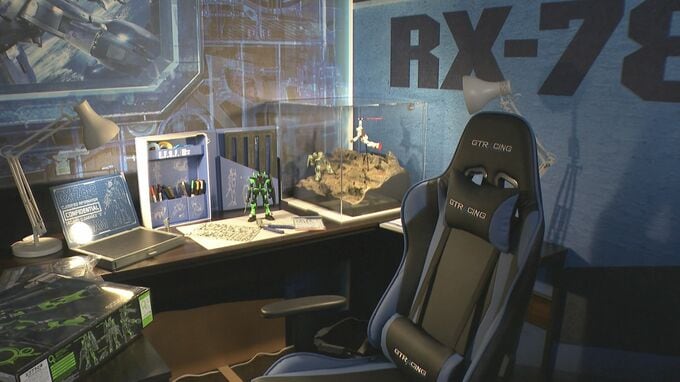 ホワイトベースをイメージした入口を開けると、コックピット風の作業デスクが登場。工具や色ペンも完備され、内部フレームをイメージした壁デザインの中で、宇宙で作戦中のガンダムを眺めながらガンプラ作りに没頭できます。