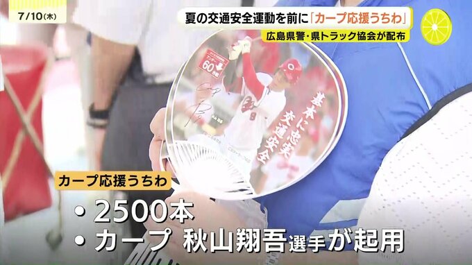 うちわは2500本用意され、デザインにはカープの秋山翔吾選手が起用されました。安全確認など、交通ルールに対する意識を高めてもらうほか、暑さで集中力を落とさないよう、注意を呼びかけることが目的です。