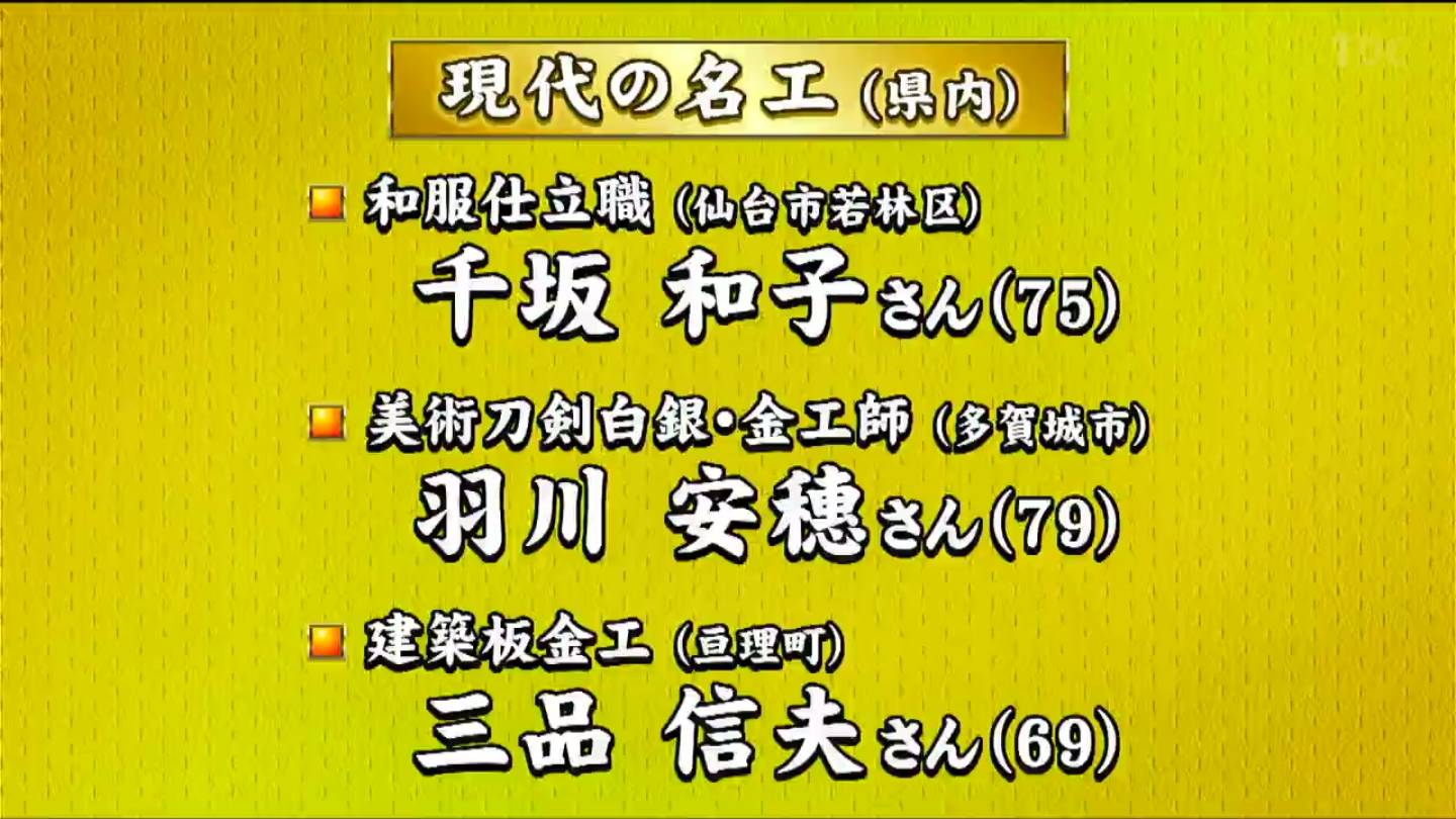 このほか、県内で受賞したのは、仙台市若林区の和服仕立職、千坂和子さん75歳、多賀城市の美術刀剣白銀・金工師、羽川安穗さん79歳、亘理町の建築板金工、三品信夫さん69歳の3人です。県内の受賞者の表彰式は、11月29日に多賀城市で行われます。