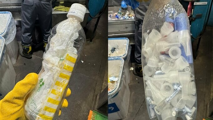 滝沢秀一さんは、「中身が入っていると資源として回収できません。ペットボトル、びん、缶の中にはごみを入れないようお願いします。」と投稿。