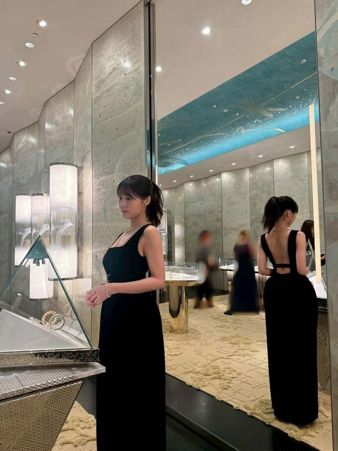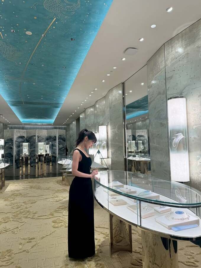 別の写真では、モダンな照明とカーペットが印象的な店内で、ジュエリーケースを眺める有村さんの後ろ姿が映し出されています。ガラスと大理石で構成された壁面が上品さを際立たせています。