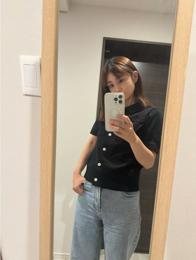 また、食事の話題だけでなく、この日の服装についても「久しぶりのデニム」と投稿。「やっぱり楽ちんだぁ」と満足感を表現しています。鏡の前で撮影された自撮り写真では、黒いシャツに青いデニムを合わせたカジュアルな装いが確認できます。