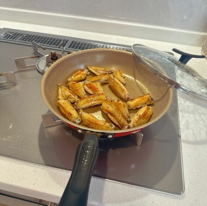 調理方法については「味付けしたらフライパンで焼くだけ!簡単で美味しい ビールが飲みたくなります笑」と、手軽さをアピール。手羽中をフライパンで焼く過程の写真も投稿されており、手羽中が黄金色に焼き上がっていく様子が確認できます。