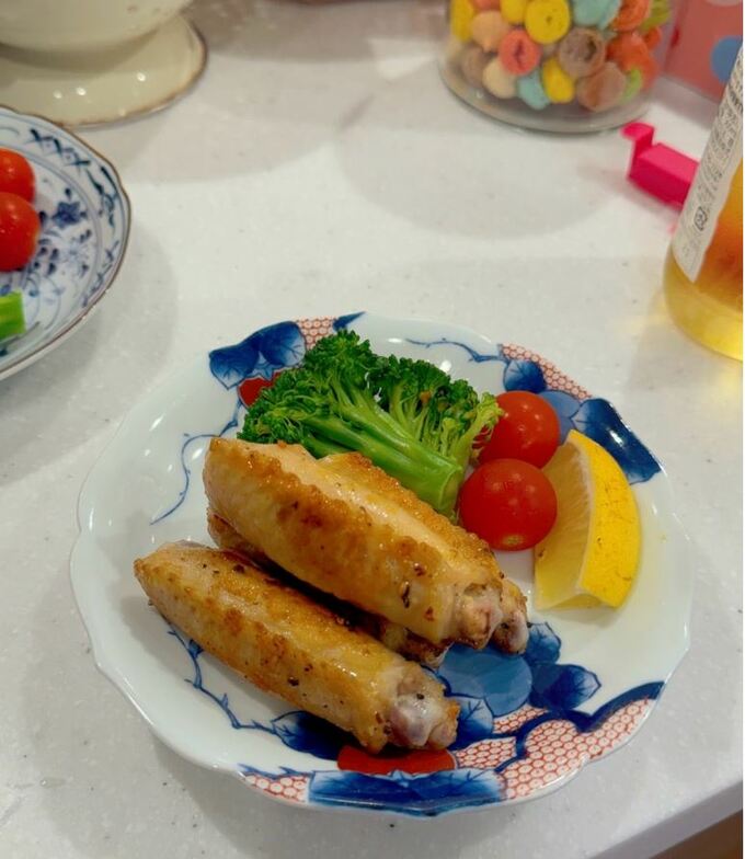 料理の写真では、こんがりと焼かれた手羽中に、ブロッコリーやミニトマト、レモンが添えられた彩り豊かな一品が映っています。
