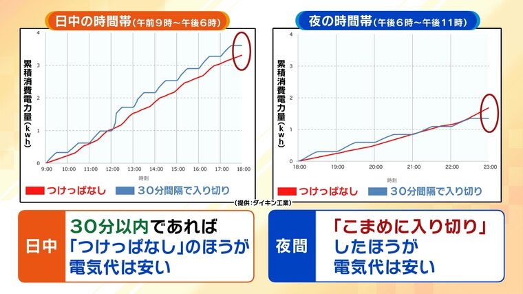 一方で夜間は、短時間の外出でもこまめに入り切りした方が、電気代は安くなるということです。日中は夜間よりも外の気温が高いため、エアコンを消したときに室温がより上がる分、再びつけた時の負荷が大きく電気代がかかるそうです。