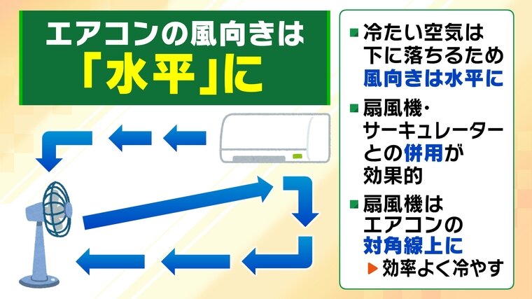 そして風向きは「水平」がいいとのこと。風向きを下げると、冷たい空気が下に滞留してしまいます。冷たい空気は下に落ちるため、最初は水平にしておき、扇風機やサーキュレーターを併用してエアコンの対角線上に置くと、効率良く冷たい空気を循環させることができます。