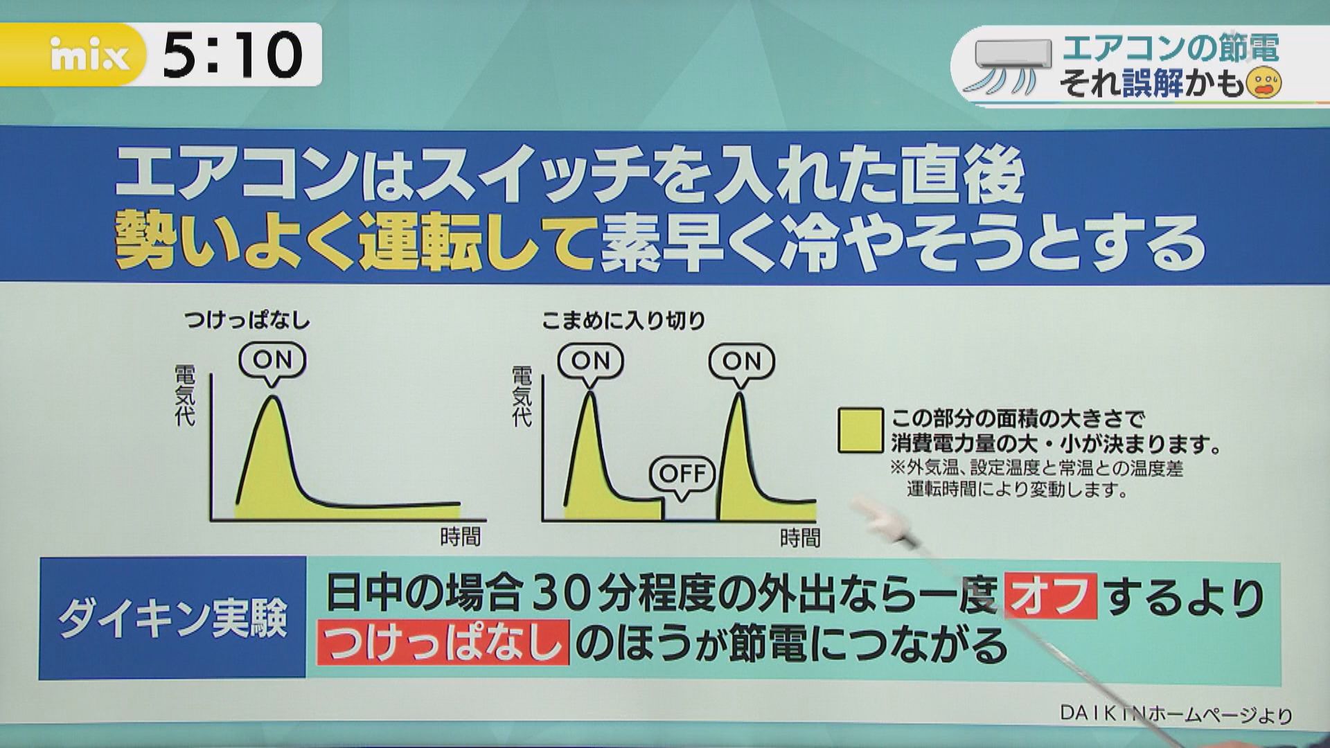「そう。これは勘違い節電術なんです。エアコンは、スイッチを入れた直後に勢いよく運転して、素早く冷やそうとします。そこで電力を使います。ダイキンの実験によると、日中の場合、30分程度の外出なら一度オフにするより、つけっぱなしのほうが節電につながるそうです。ただ、あくまでこれは外気温と設定温度の差が激しい日中の場合なので、夜になると変わってきます」