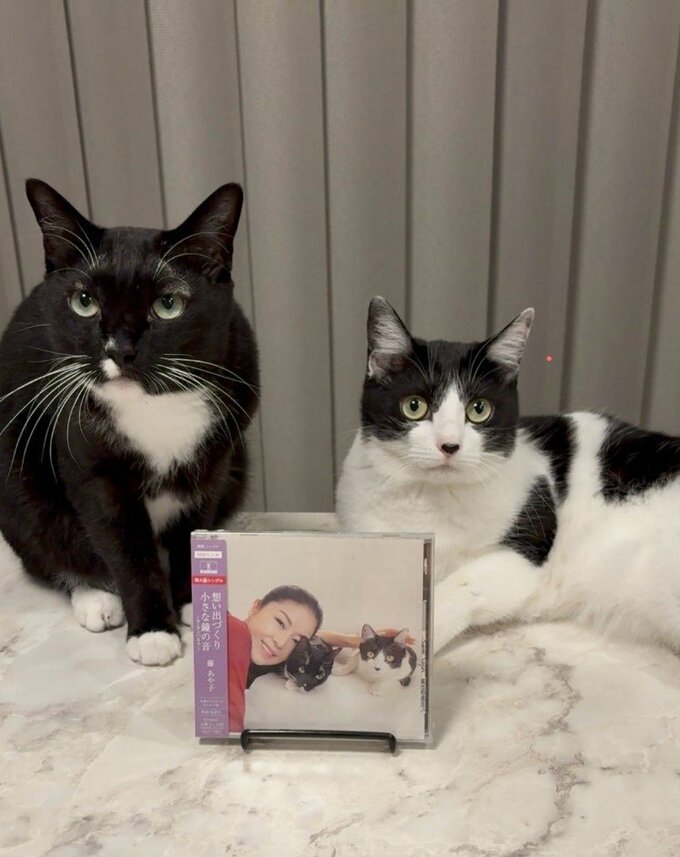 歌手の藤あや子さんが自身のブログで、愛猫のマルとオレオと一緒に新曲のCDジャケットに登場したことを投稿しました。