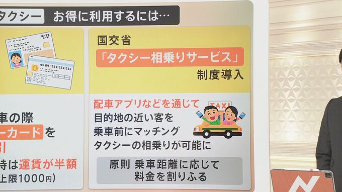 国交省は「タクシー相乗りサービス」という制度を導入します。配車アプリなどを通じて目的地の近いお客さんを乗車前にマッチングしてタクシーの相乗りが可能になります。こういったサービスを使うことでお得に乗ることができるということです。