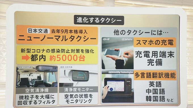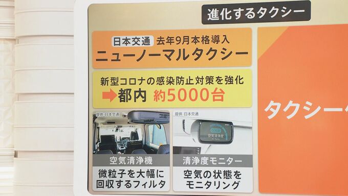 コロナ禍ということでタクシー会社は様々な対策を行っています。日本交通は去年9月にコロナ禍のニューノーマルに適合したタクシーを本格導入しました。現在都内で走っている約5000台のタクシー車内には微粒子を大幅に回収するフィルタの空気清浄機や空気の状態をモニタリングできる清浄度モニターが設置されています。