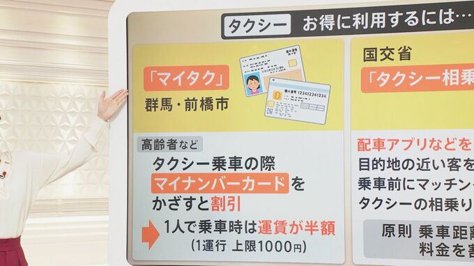 お得に利用できるサービスもあります。群馬県前橋市の「マイタク」です。高齢の方などがタクシー乗車の際にマイナンバーカードをかざすと割引してもらえるというものなんです。1人で乗車している場合は運賃が半額になります。(1運行 上限1000円)