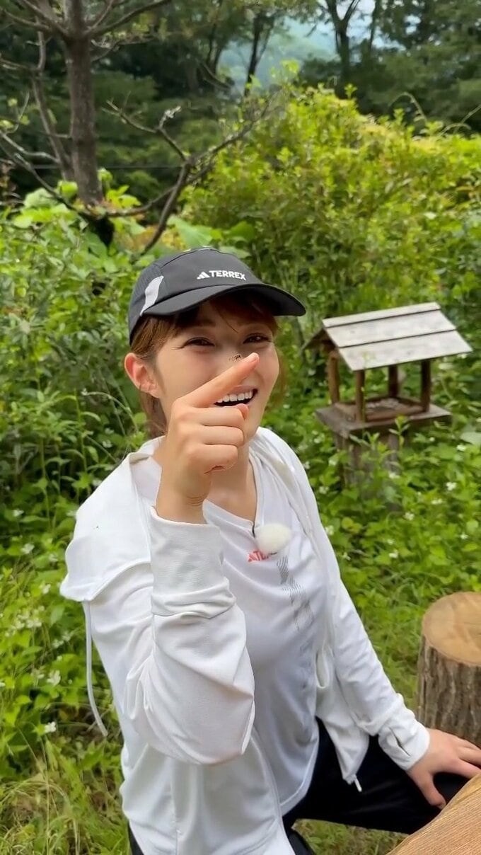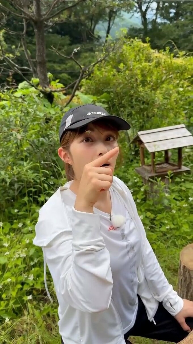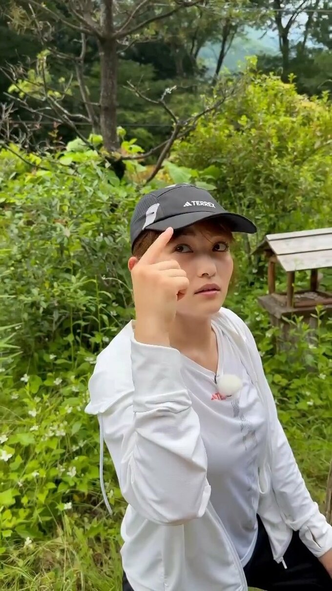 井上さんは、緑が生い茂る中でランニング用の衣類と黒のキャップを身につけて動画に登場。目を宙に向けて、右の人差し指をクルクルと回しています。