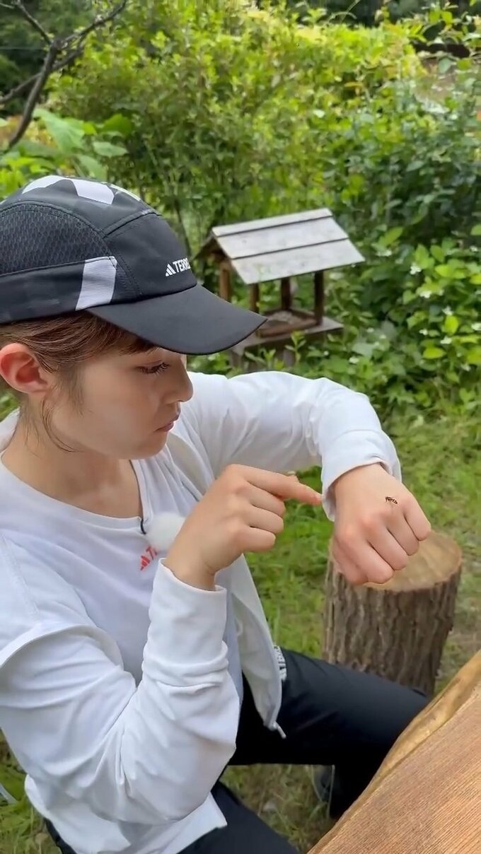 すると、ハチのような羽虫が井上さんのそばに飛んできて、井上さんの人差し指に止まってみたり、左手の手の甲に乗ってみるなど、親しげな動きを繰り返しています。そのたびに井上さんも嬉しい微笑みを繰り返していて、癒やしの動画になっています。