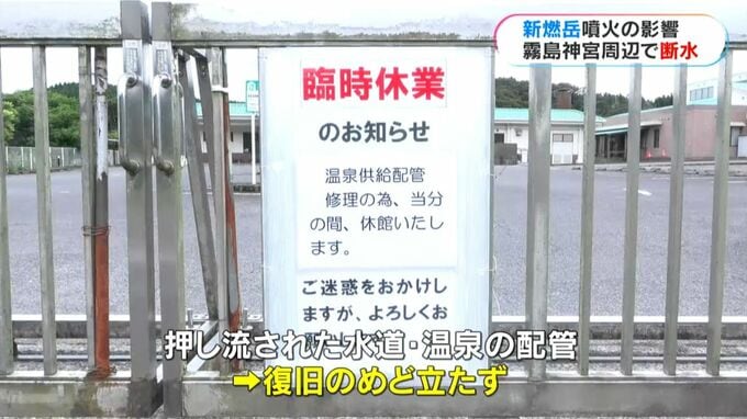 この付近には、水源につながる水道の配管などがありましたが、10日午後4時すぎ、火山灰を含んだ泥水に押し流されました。この影響で、霧島神宮付近などあわせて34戸で断水が起きています。