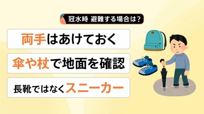 歩く際は、▼両手をふさがない。▼傘や杖で、陥没していたり障害物があるかないか、地面を確認する。▼長靴ではなく、歩きやすいスニーカーを履く。▼1人では歩かない。▼黄色やオレンジなど、何かあっても救助・発見されやすいものを1つ身につけておく。これを大事にしてください。