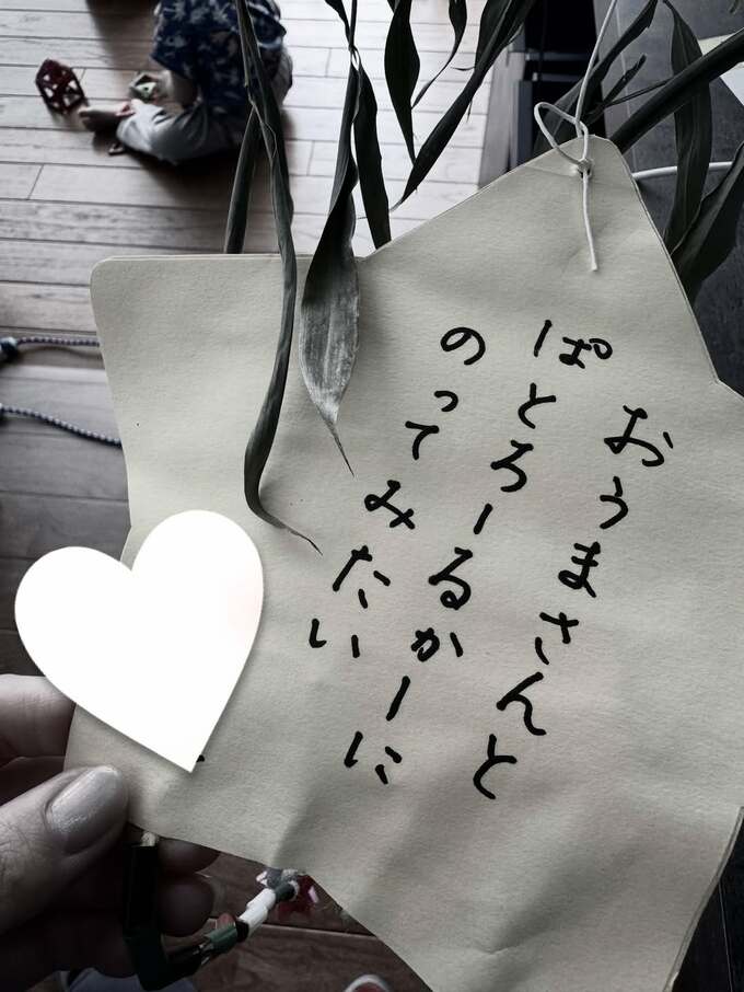 そして「先日の七夕は何をお願いしたか息子に聞くと『ベイビーが元気に生まれてきますように』と言ってくれてとても泣けました。」「でも園から持って帰ってきた短冊は『おうまさんとぱとろーるかーにのってみたい』でした。そんな正直な息子が大好きです!!」と、記しました。