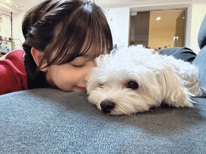梶原さんは「定期的にインスタに現れるあらさん」と記し、ベッドで寝そべりくつろぐ、愛犬のあられちゃんに目をつぶりながら顔を寄せる様子を掲載しました。
