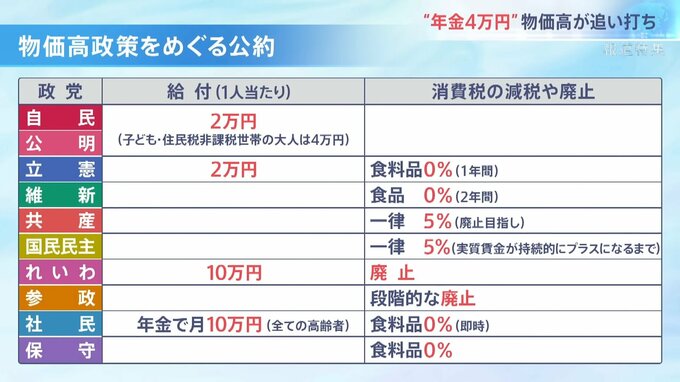 今回の参院選で最大の争点となっている物価高対策。一人当たり2万円給付を公約に掲げ、賃上げによる物価高の克服を訴える与党に対し、野党は消費税の減税や廃止などを主張している。