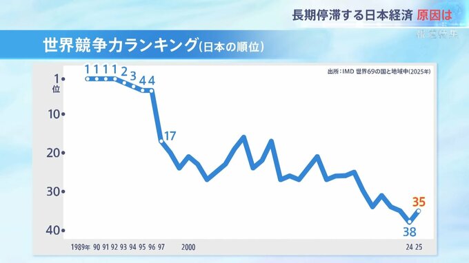 統計が始まった1989年から4年連続で1位を記録していた日本だが、その後、30年にわたって下降傾向をたどり、2025年版では35位となった。