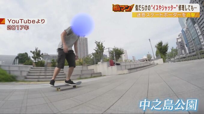 動画投稿サイトに投稿された映像。場所は、大阪市の中之島公園です。スケートボードは禁止ですが、タイルを使って技を繰り出す様子などが写っています。