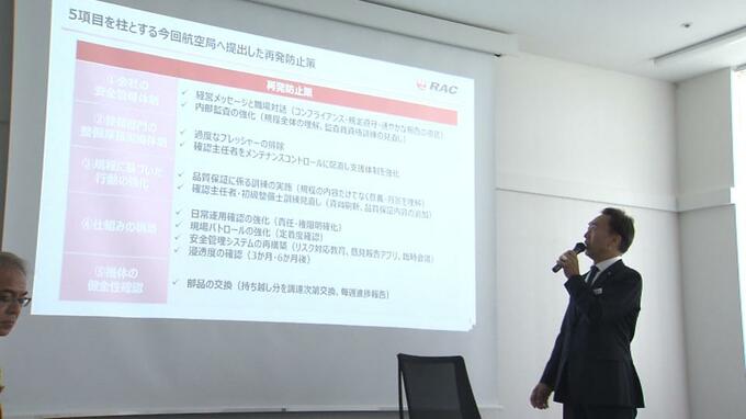 14日開かれた会見で、琉球エアーコミューターの山田賢哉社長は、定刻に間に合わせて運航しようとする「定時性」への過剰な意識や、プレッシャーから問題が発生したとして、定時性よりも安全を優先することや、整備の現場をサポートする確認主任者の配置などの再発防止策を発表しました。