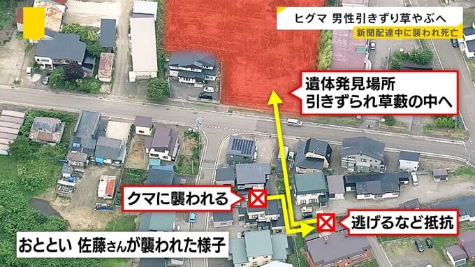佐藤さんは民家の前でクマに襲われ住宅街に逃げ込みましたが、その後、草やぶまで100mほど引きずられたと見られています。