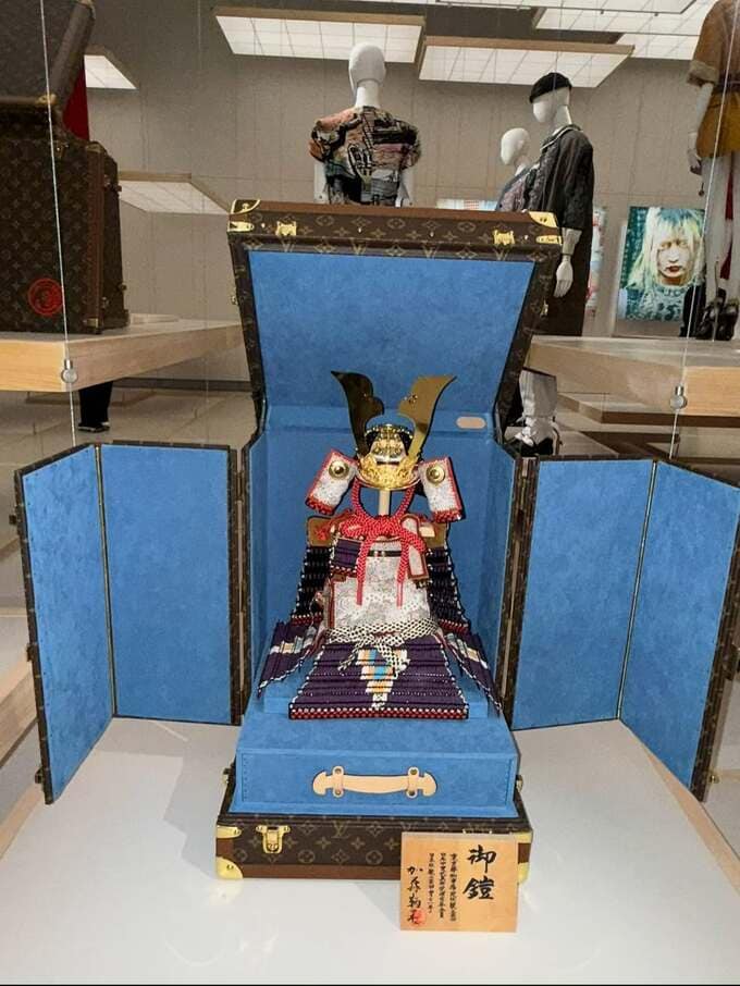 展示の様子も複数枚の写真で紹介されており、黒いモノグラム柄のトランクや赤と金を基調とした甲冑など、伝統と革新が融合した展示物があります。