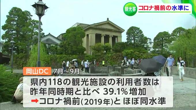 7月から9月に実施された岡山県とJRグループによる大型観光キャンペーン岡山デスティネーションキャンペーンについて、岡山県内の多くの観光施設の利用者数が新型コロナ拡大前の2019年並みに回復したことがわかりました。
