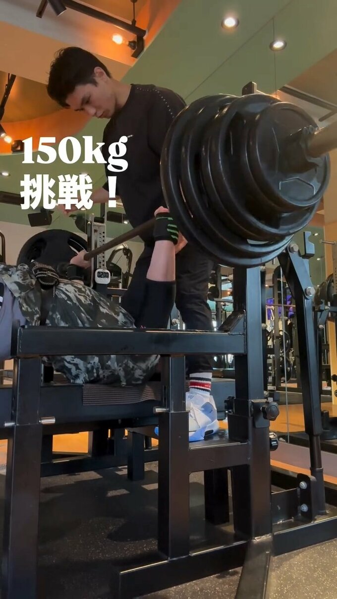 藤原さんは「ベンチプレスMax挑戦」とテキスト。その重量は「150kg」と明記していて、投稿している動画にも「150kg挑戦!」とテロップを載せています。