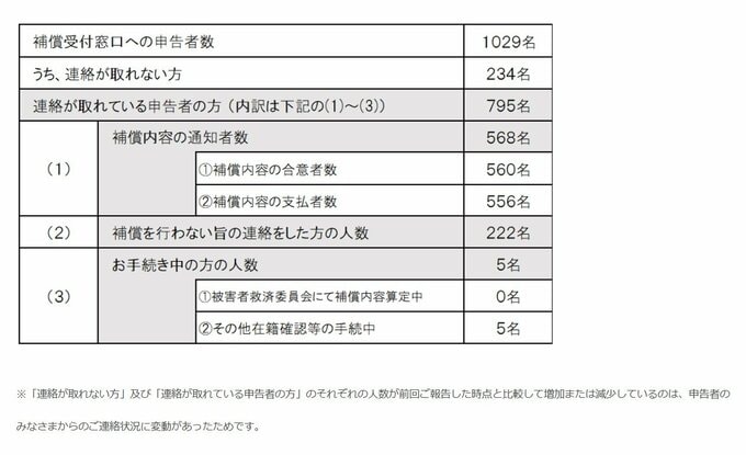 公式サイトでは「被害者救済委員会は被害補償の受付開始後、本日時点までに、合計1029名の方から補償申告をいただいております。そのうち234名の方は、複数回のご連絡を試みてもご返信がない状態です。」と、投稿。