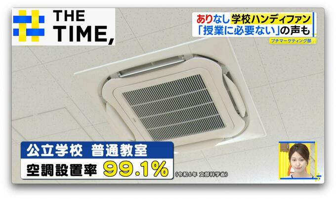 文部科学省の調査(令和6年)によると、公立の学校でも普通教室は99.1%がエアコン設置済み。そのためハンディファンは必要ないという意見も根強いのです。